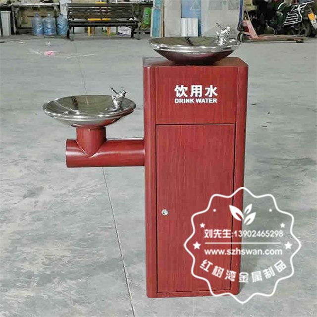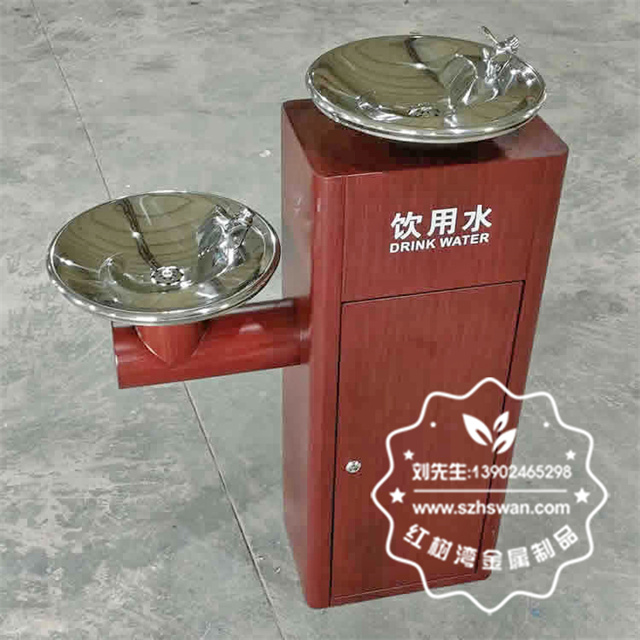 產品材質:戶外景區公共轉木紋胡桃色不銹鋼飲水機采用了304不銹鋼板制作而成,雙盆方形底座設計,金屬表面胡桃色轉木紋,雙盆不銹鋼本色亮光,箱體油墨絲印飲水機中英文文字,可以使用三角鑰匙開門,內置帶過濾系統。
