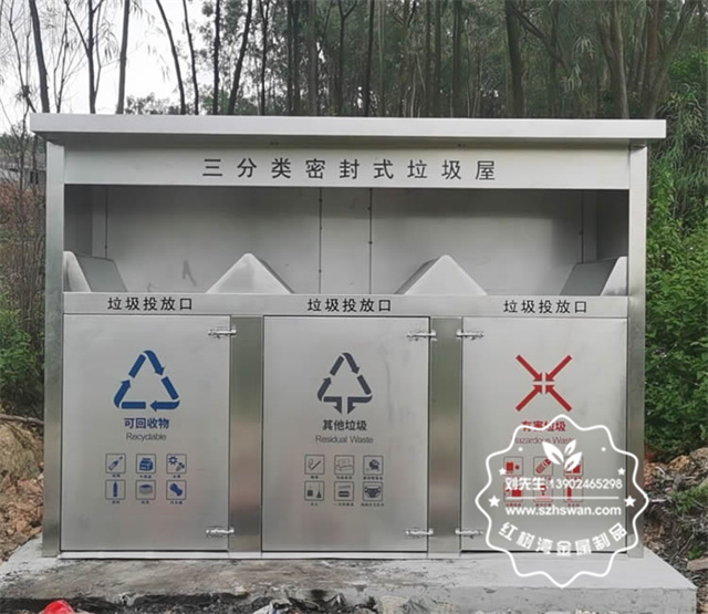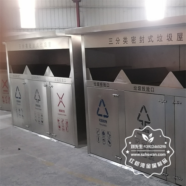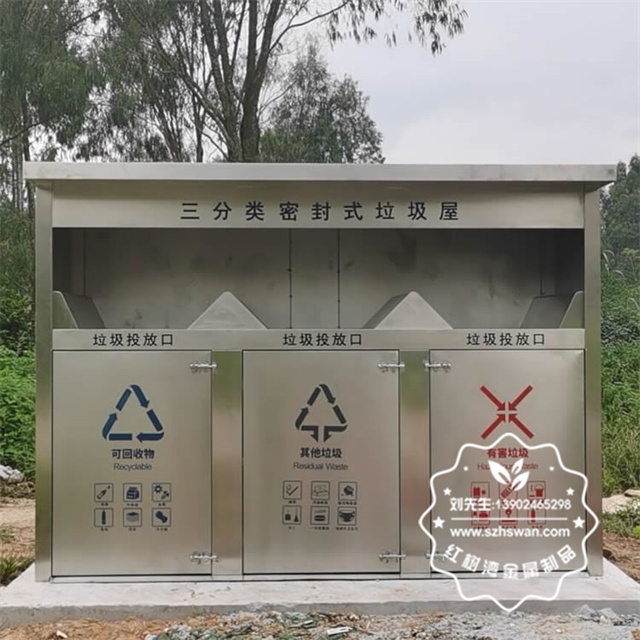 產品材質:戶外密閉式三連體不銹鋼分類垃圾屋采用201#,202#,304#優質不銹鋼材料模壓成型,堅固耐用;內外表面光潔,減少垃圾殘留,易于清潔;配置鍍鋅板內桶,便于垃圾清倒;
