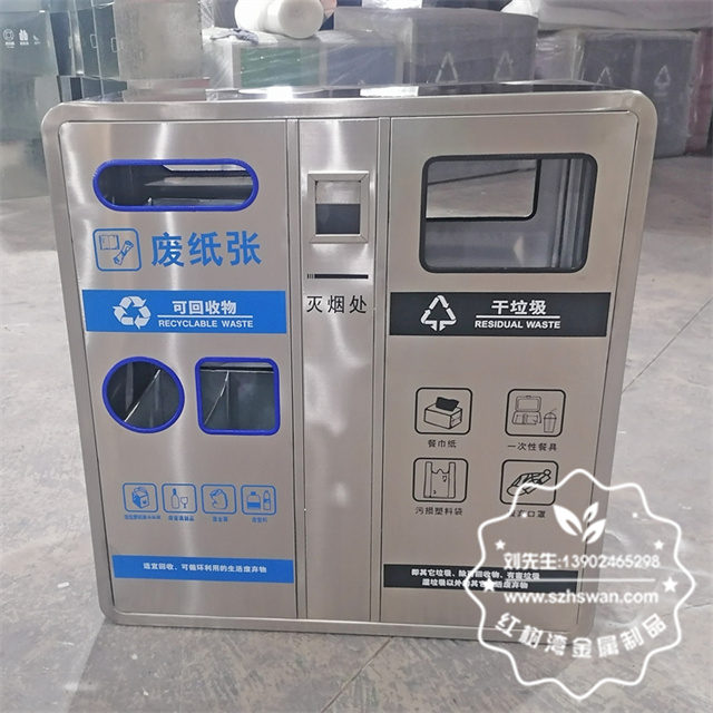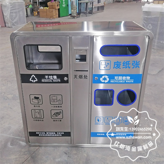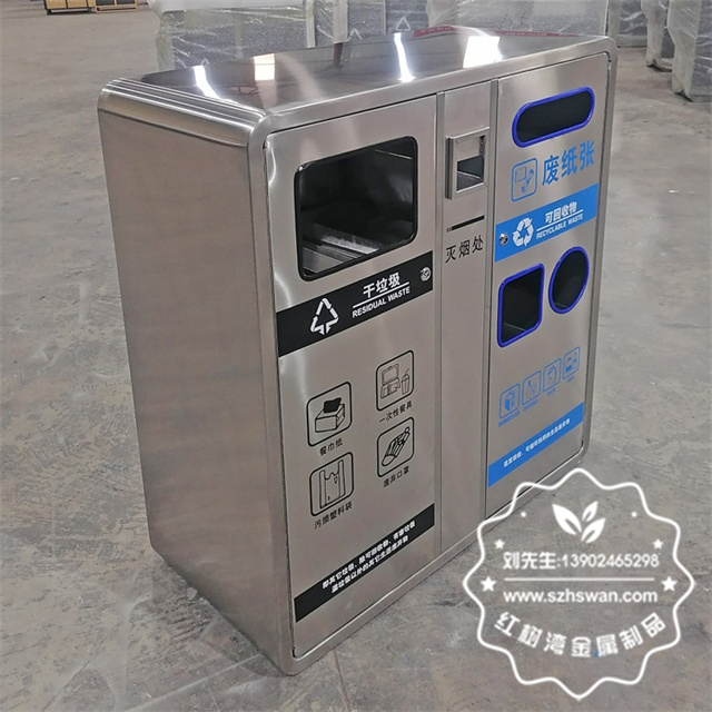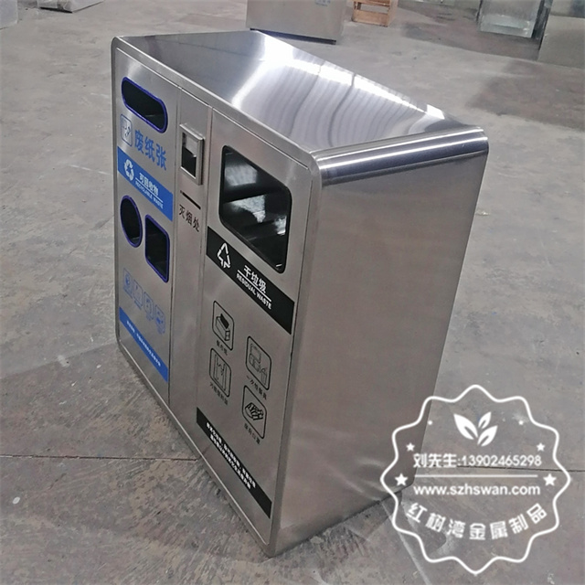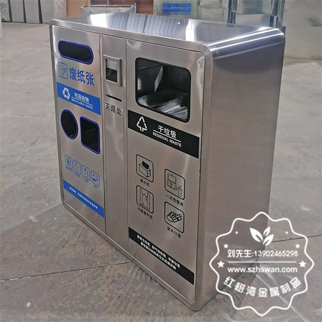 產品材質:城市街道大容量不銹鋼分類垃圾箱采用201#,202#,304#優質不銹鋼材料模壓成型,堅固耐用;內外表面光潔,減少垃圾殘留,易于清潔;配置鍍鋅板內桶,便于垃圾清倒;