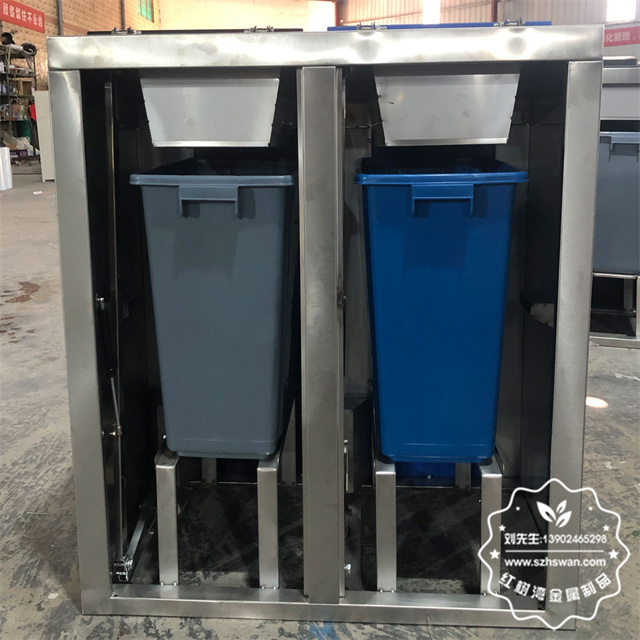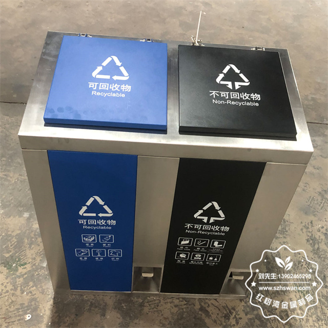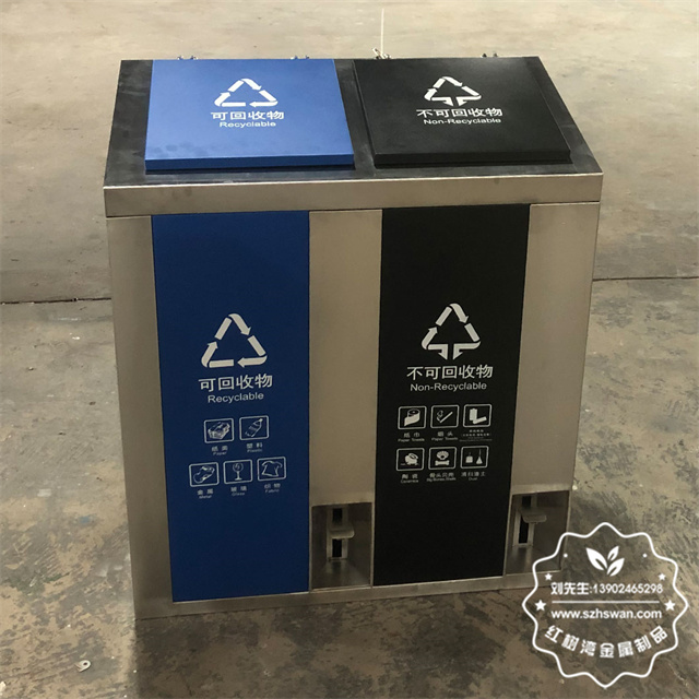 產品材質:戶外腳踏式兩連體不銹鋼分類垃圾桶采用201#,202#,304#優質不銹鋼材料模壓成型,堅固耐用;內外表面光潔,減少垃圾殘留,易于清潔;配置鍍鋅板內桶,便于垃圾清倒;