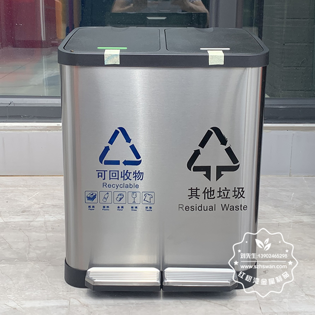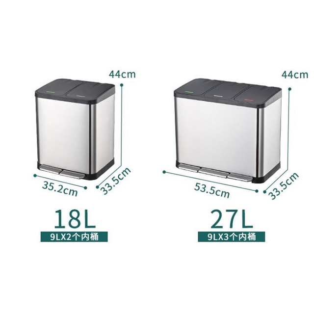 產品材質:室內小型不銹鋼腳踏式分類垃圾桶利用杠桿原理,由外筒、內筒、筒蓋、支架、連桿、踏桿等部分組成。采用201#,202#,304#優質不銹鋼材料模壓成型,產品內外光潔高檔大氣;