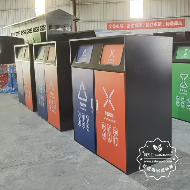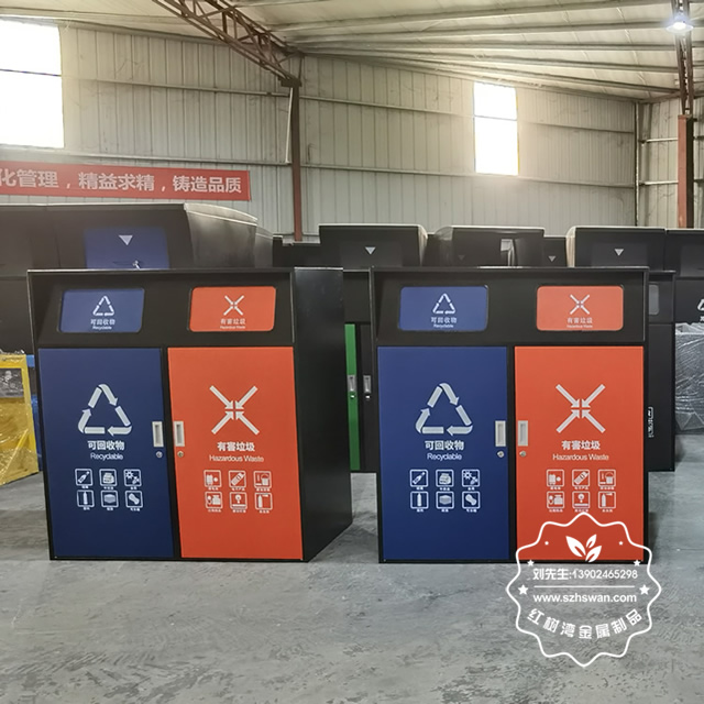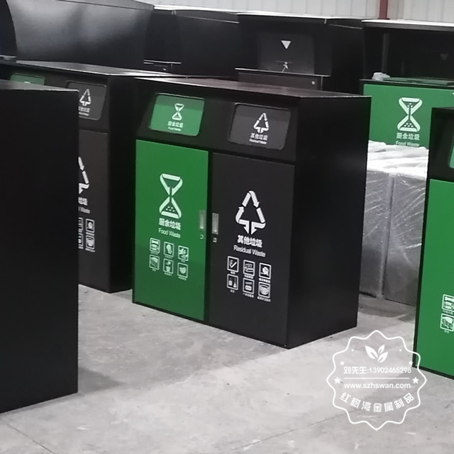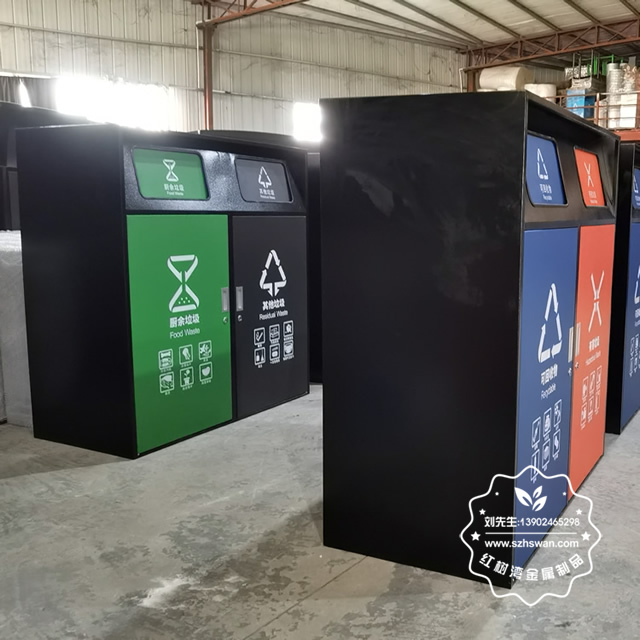 產品材質:小區有蓋鍍鋅板分類垃圾桶采用優質冷軋鋼經除油-除銹-表調-磷化處理后,表面采用汽車靜電粉末經過180~220℃高溫烤漆,使粉末熔化黏附在金屬表面,雙層防銹,漆面色澤耐久;