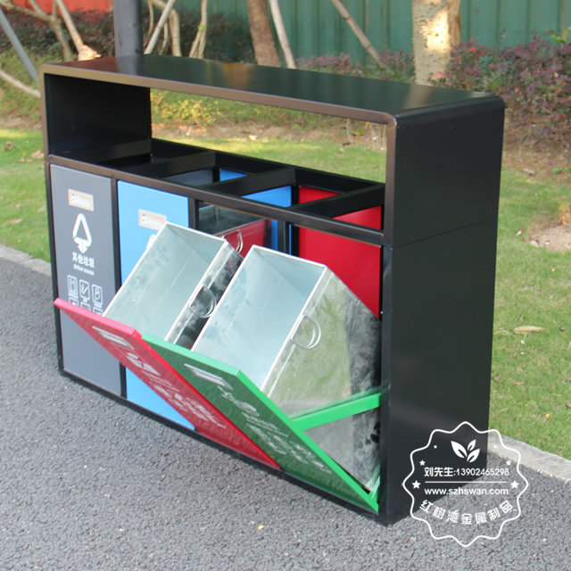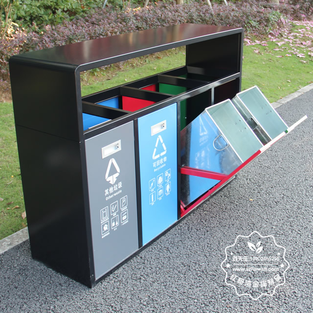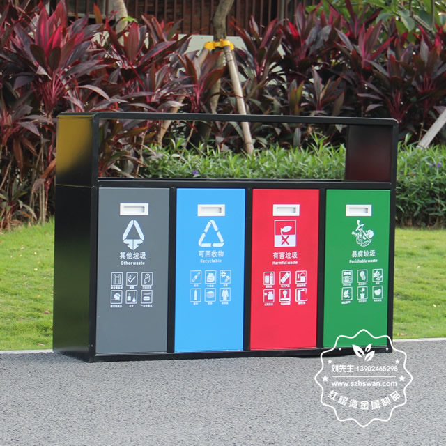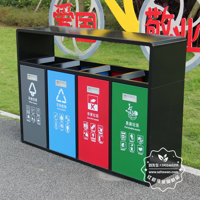 產品材質:戶外噴塑四分類鋼制垃圾箱表面經過除油、噴砂防銹處理后,再進行酸洗磷化處理;表面清理后整體進行靜電噴涂或烤漆處理,靜電噴涂是經過流水線高溫固化爐固化后再出爐冷卻,漆面色澤耐久,防腐防銹;