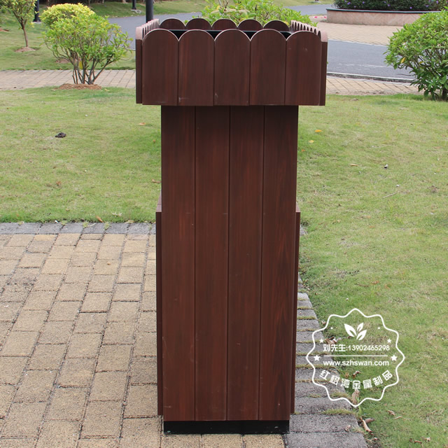 產品材質:環保塑木花箱鋼木分類垃圾桶木部分可選用優質進口山樟木、防腐木或塑木,經防腐烘干處理后加工成型。桶身框架采用冷軋鋼板加工,表面經酸洗磷化噴塑處理組裝而成,使其戶外耐候持久,防腐防蛀不變形等優點;