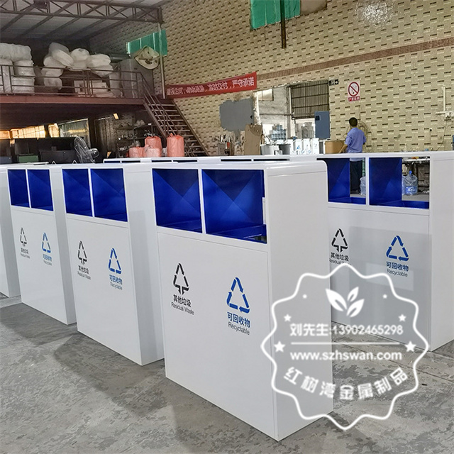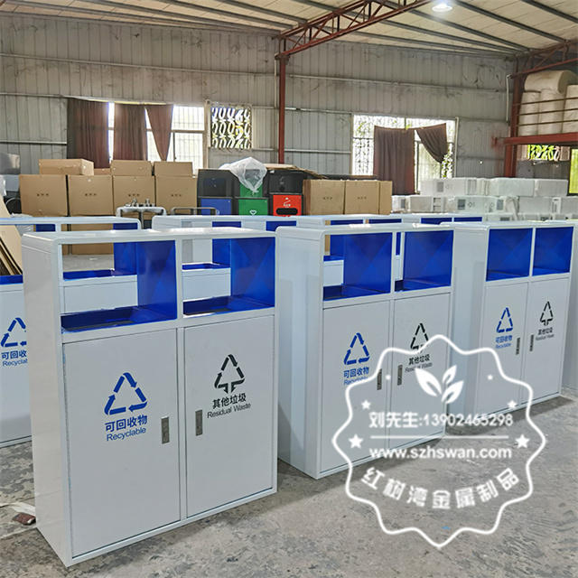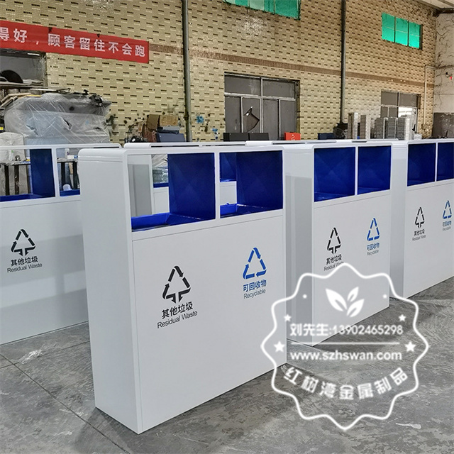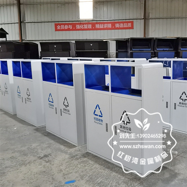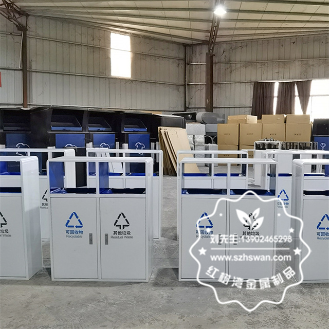產(chǎn)品材質(zhì):戶外鍍鋅板烤漆白色連體分類(lèi)垃圾桶表面經(jīng)過(guò)除油、噴砂防銹處理后,再進(jìn)行酸洗磷化處理;表面清理后整體進(jìn)行靜電噴涂或烤漆處理,靜電噴涂是經(jīng)過(guò)流水線高溫固化爐固化后再出爐冷卻,漆面色澤耐久,防腐防銹;