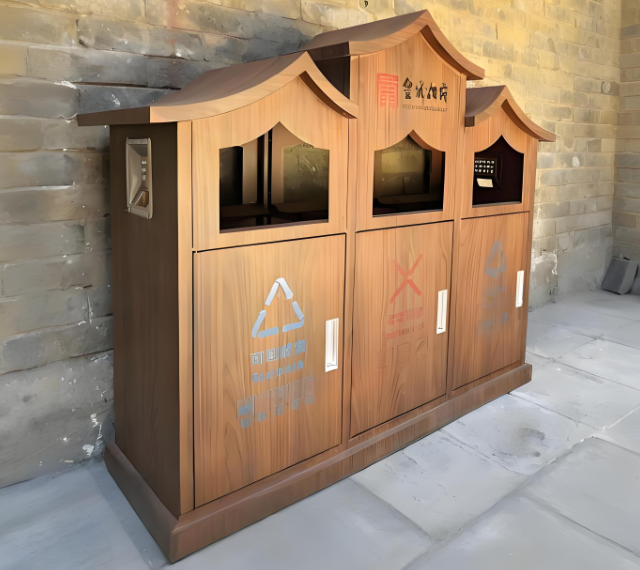 在杭州西溪濕地公園的綠道上,一組造型別致的垃圾桶吸引了游人的目光。這些垃圾桶頂部采用傳統(tǒng)江南民居的坡屋頂造型,表面覆蓋著天然木紋肌理,與周邊竹林景觀完美融合。若不是醒目的垃圾分類(lèi)標(biāo)識(shí)提示,游客幾乎要將其誤認(rèn)為園林建筑小品。這些看似藝術(shù)裝置的設(shè)施,正是當(dāng)前城市更新浪潮中涌現(xiàn)的戶外轉(zhuǎn)木紋金屬屋形三分類(lèi)垃圾桶。它們以獨(dú)特的設(shè)計(jì)語(yǔ)言重構(gòu)了城市基礎(chǔ)設(shè)施的審美范式,將垃圾分類(lèi)這一環(huán)保行為升華為城市空間美學(xué)體驗(yàn)的重要組成。