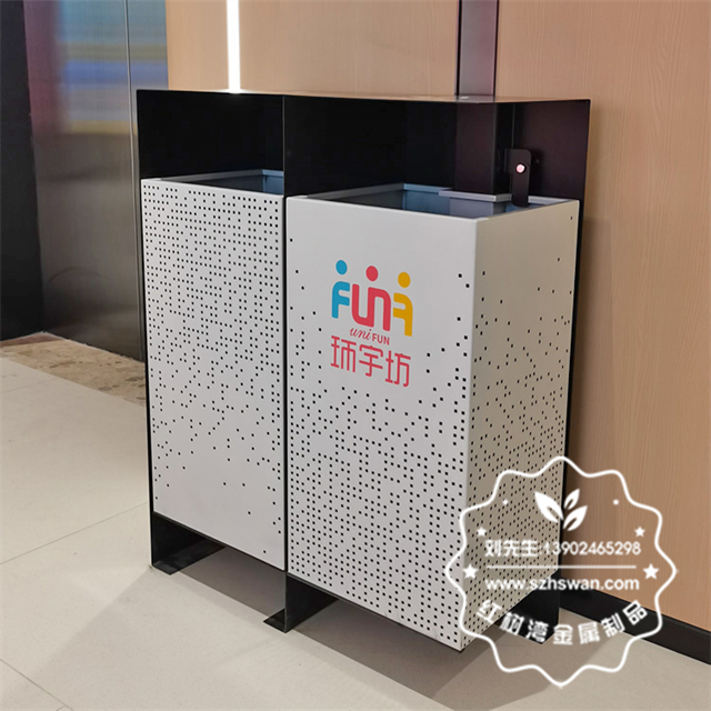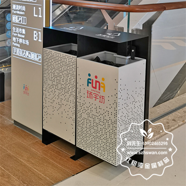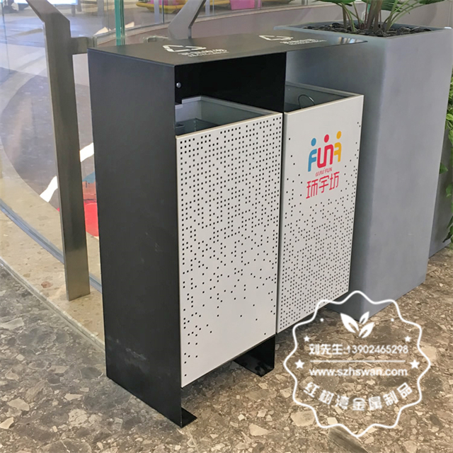 產品材質:成都商場兩連體鏤空不銹鋼垃圾桶采用201#,202#,304#優質不銹鋼材料模壓成型,堅固耐用;內外表面光潔,減少垃圾殘留,易于清潔;配置鍍鋅板內桶,便于垃圾清倒;