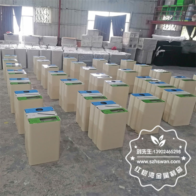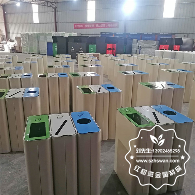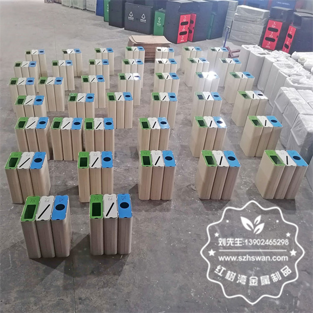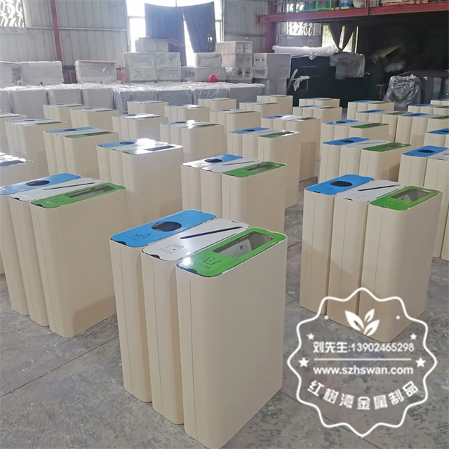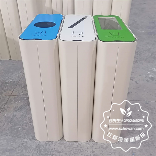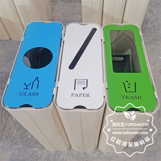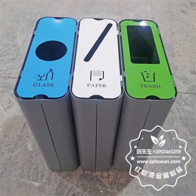 產品材質:出口室內商用噴粉三分類不銹鋼果皮箱采用201#,202#,304#優質不銹鋼材料模壓成型,堅固耐用;內外表面光潔,減少垃圾殘留,易于清潔;配置鍍鋅板內桶,便于垃圾清倒;