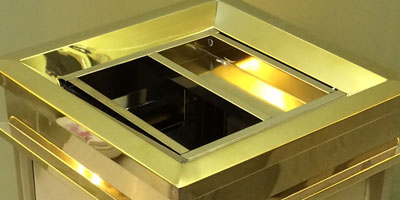 產品材質:電鍍玫瑰金鏤空室內方形不銹鋼垃圾桶采用優質不銹鋼材料經專業除銹處理,表面采用專用戶外高溫烤漆,保證色彩鮮艷持久,有效防止生銹。外飾大理石表面呈金黃色,光滑亮麗彰顯高貴本色;